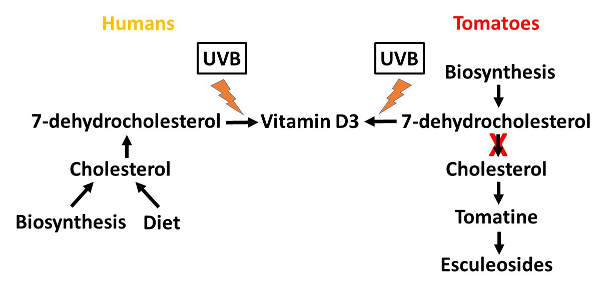 Using modern genetic engineering techniques, the authors knocked out (deleted) the gene coding for the protein responsible for converting 7-dehydrocholesterol to cholesterol in tomatoes (shown as the red X in the figure above).