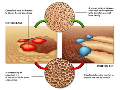 - However, as we age osteoclast activity predominates, and we start to lose bone density. Eventually our bones look like Swiss cheese and break very easily. This is called osteoporosis. The bottom portion of the picture depicts this.