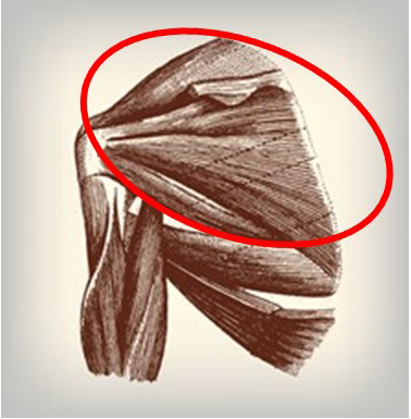 There are 16 muscles that all insert into your shoulder, each pulling your arm in a different direction. Each is important and you use them all every day. But we won’t go into all of them this month, we’re just looking at the large muscle inside the red circle. (I’m not an artist so saying “circle” is just using creative license – LOL)