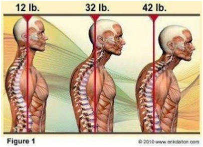 Notice the graphics on the left, and then imagine the 42 lb head on the right not only putting a strain on the entire cervical spine, but since you are looking down, it is also having the heavy skull putting a twist onto the first two cervical vertebrae.
