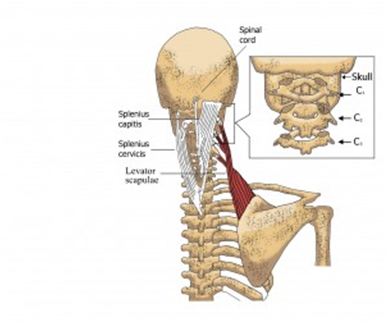 Take a look at the muscle that is labeled “levator scapulae.” Nicknamed “the shrug muscle,” because it lifts up your shoulders, it originates on C1-4, although the greatest problem is with the C1-2 points. As your levator scapulae muscle gets tight, it pulls the two vertebrae to the side and down. This causes the bone to press into your spinal cord at the very base of your skull where it exits from your brain and begins its journey down to your tailbone.
