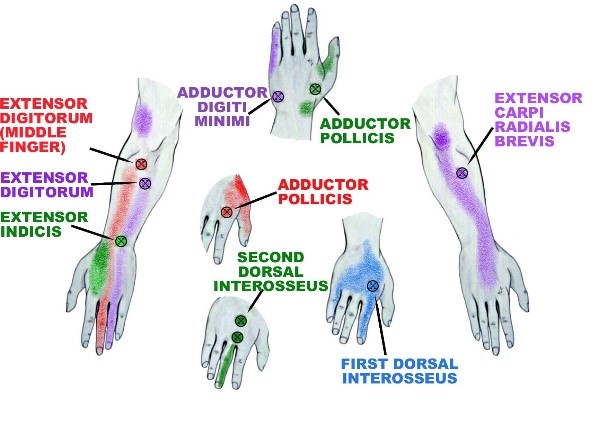 This same principle applies with muscles. The pain will refer to the insertion point in the wrist or hand.
